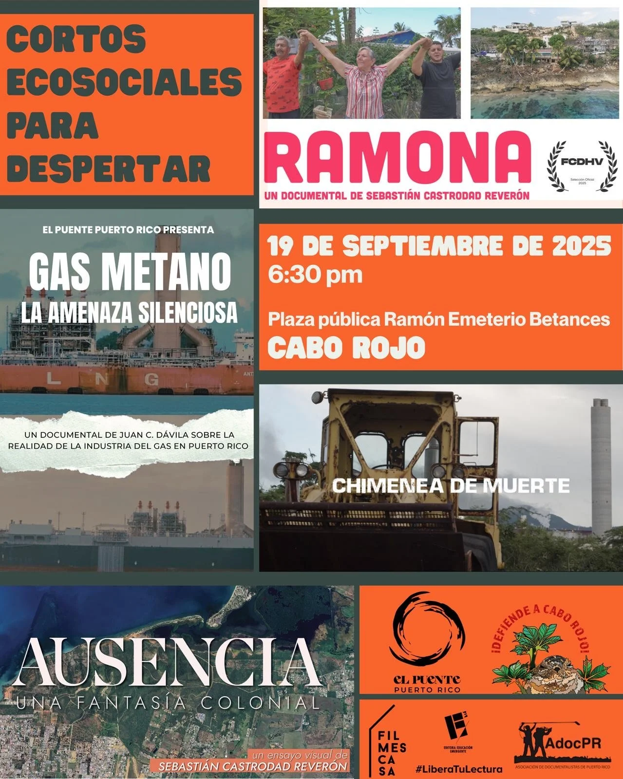 Además habrá un conversación moderada por Mónica Flores de El Puente PR y Beatriz Llenín Figueroa, editora de Educación Emergente y Coalición Defiende a Cabo Rojo con Federico Cintrón Moscoso de El Puente PR, Julia Mignucci de Mayagüezanos por la Salud y el Ambiente, Sebastián Castrodad Reverón, documentalista de Ramona y Ausencia, y Yarelmi Iglesias Vázquez, directore, Chimenea de muerte, sonidista y representante de Filmes Casa.
