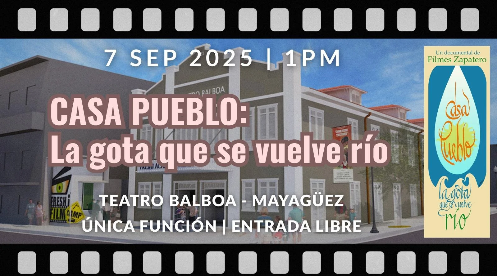 El documental Casa Pueblo: la gota que se vuelve río se proyectará este domingo, 7 de septiembre a la 1:00 de la tarde en el Teatro Balboa de Mayagüez.