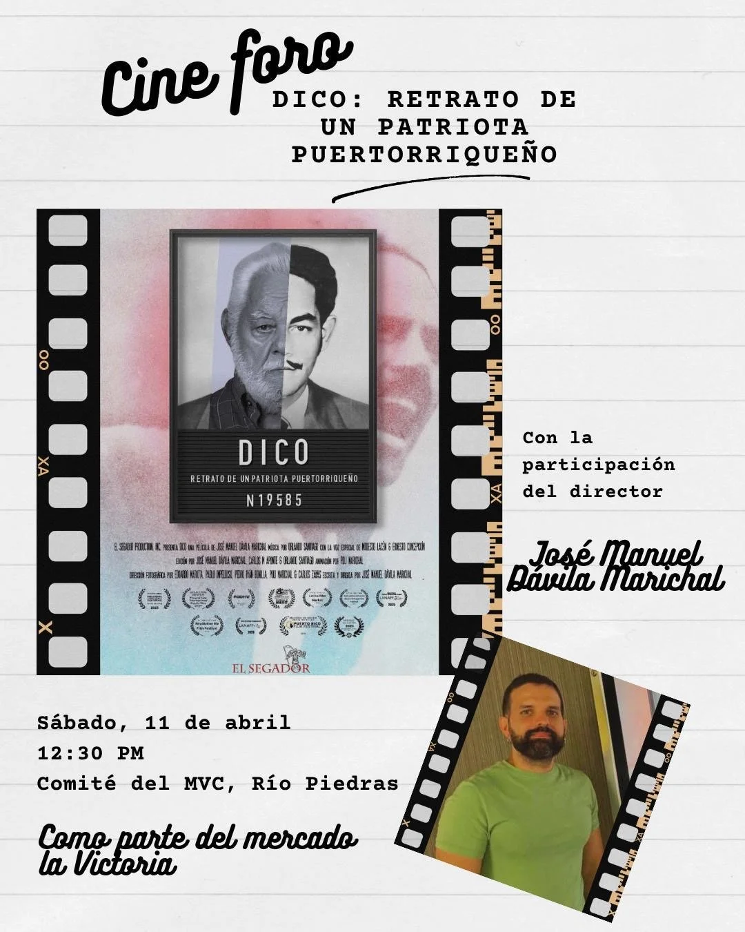 Cine Foro 'Dico: Retrato de un Patriota Puertorriqueño" sábado, 11 de abril de 2026 12:30 p. m. 3:00 p. m. Comité MVC, Río Piedras (mapa) Google Calendar ICS